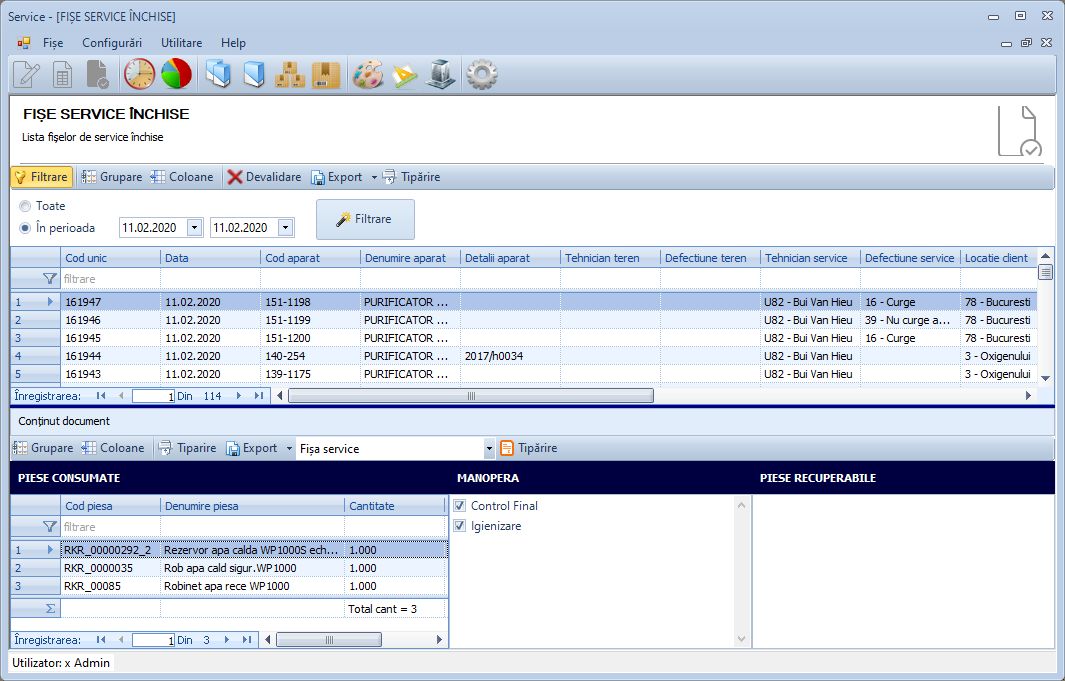 Upon ticket closure, the system automatically generates the consumption note for used parts and the customer invoice. Spare parts stock is automatically updated.